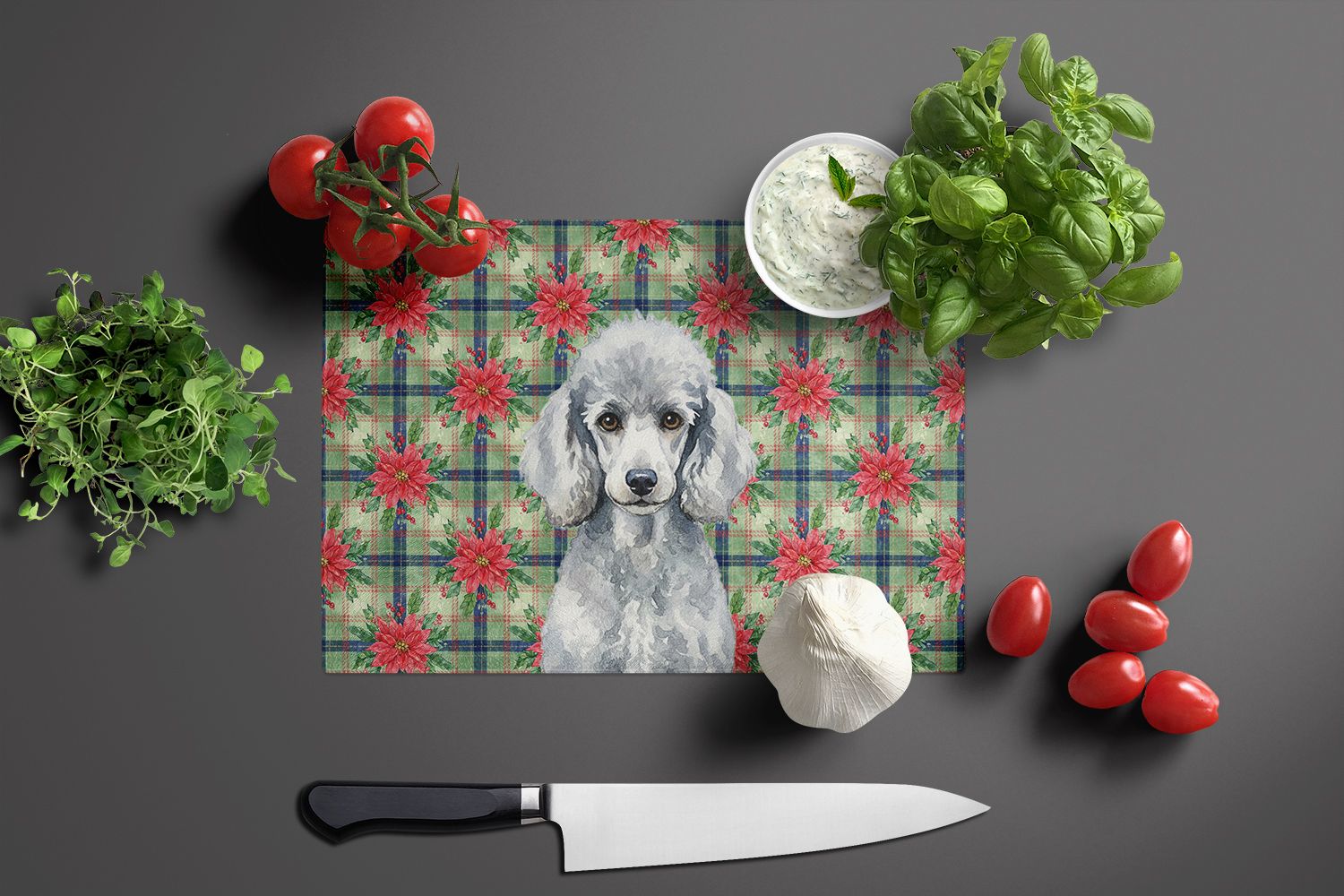 Home > Standard Silver Poodle Christmas PoinsettIas Glass Cutting Board Decorative Tempered Glass Kitchen Cutting and Serving Board Large Size Chopping Board