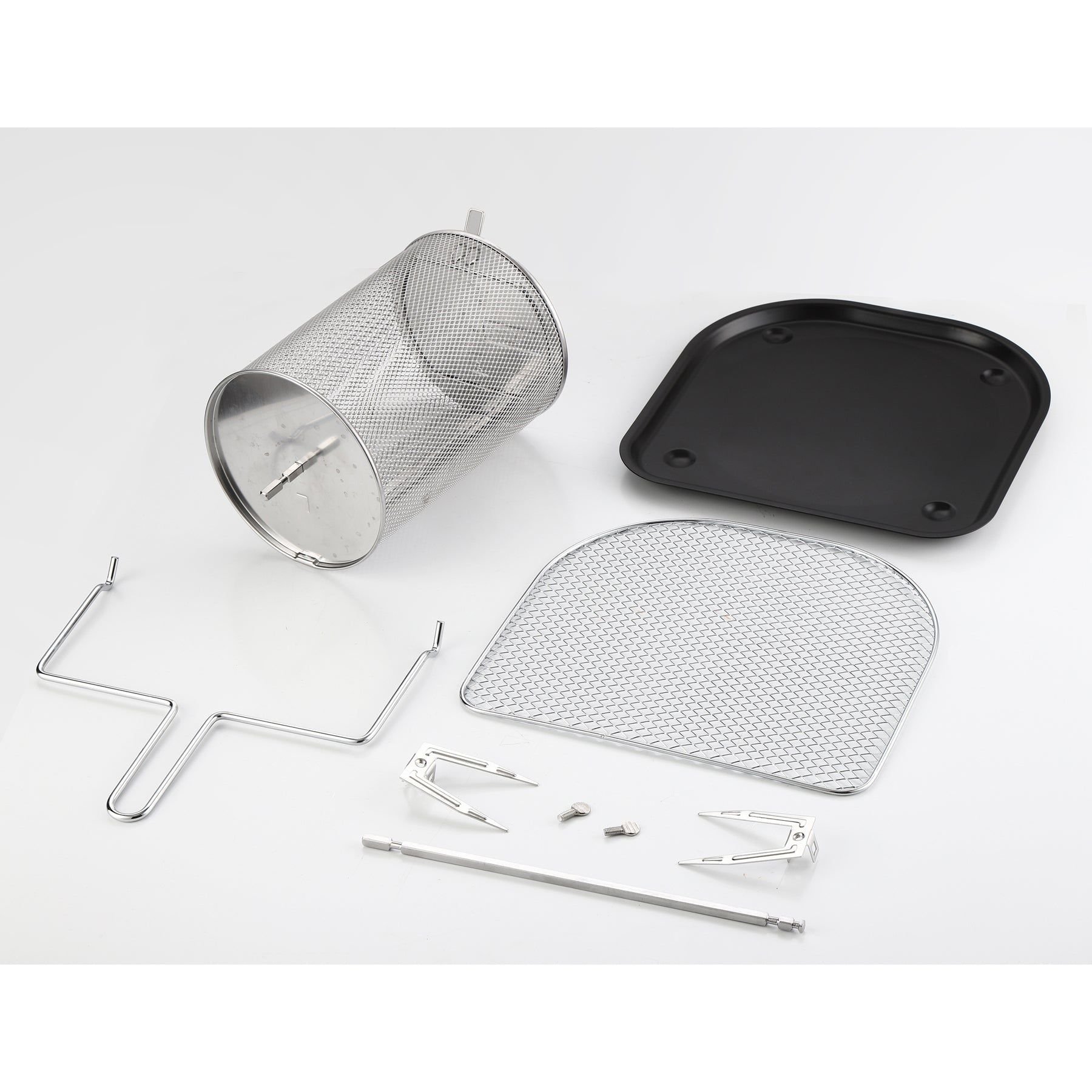 - Accessories: Rotating Mesh Basket, Drip Tray, Rotisserie Fetch Tool, Air Flow Tool, Air Flow Rack, Rotisserie Shaft, 1 Set Of Forks And Screws, Manual